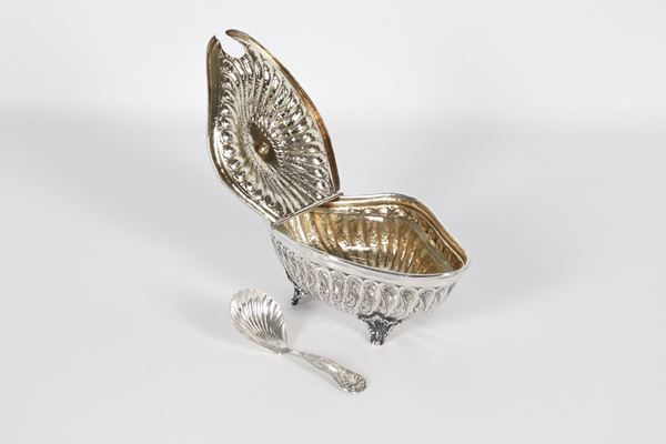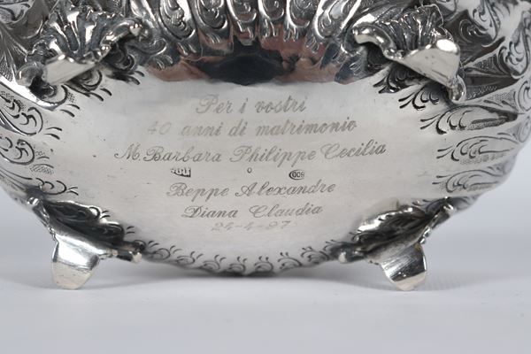 Oval-shaped silver cheese bowl, entirely chiseled and embossed with floral pods and scrolls, with a flower-shaped knob and four curved feet, [..]