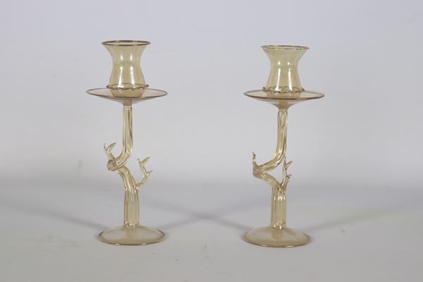 Pair of amber blown Murano glass candlesticks, with tree trunk shaped stem