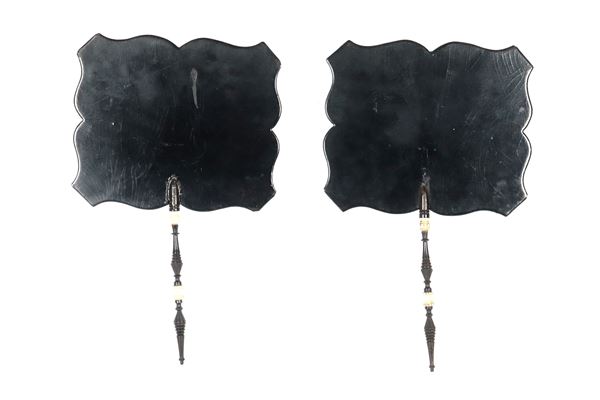 Pair of antique English fans from the Queen Victoria period, in papier maché with a shaped form, lacquered and painted with "Landscapes" [..]
