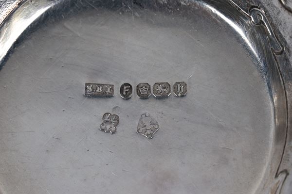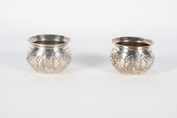 Pair of antique English salt cellars, Queen Victoria period, in chased and embossed silver with medallion motifs with mythological figures and [..]