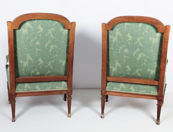 Pair of antique French Bergère armchairs in mahogany with Louis XVI motif carvings, green fabric covering