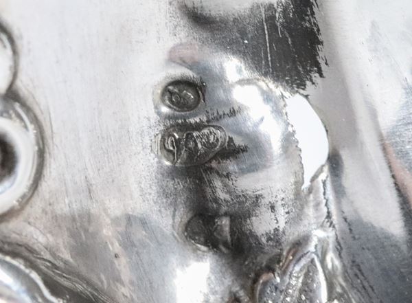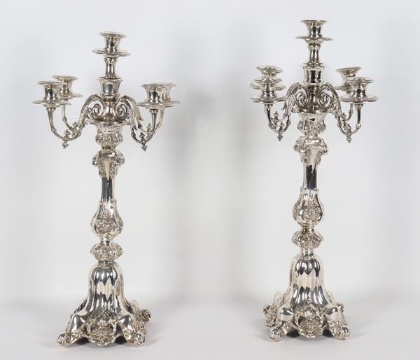 Pair of antique French candelabra in chiseled and embossed silver with scroll motifs, bunches of grapes and leaves, 5 flames each. One candelabra [..]