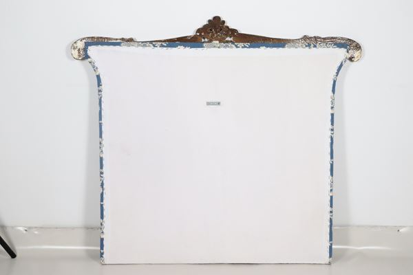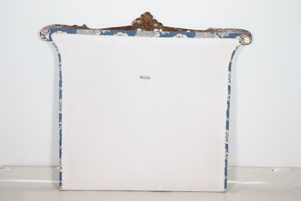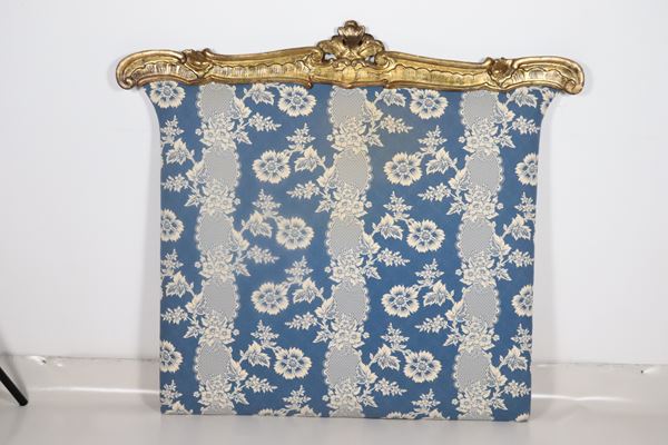 Pair of antique single bed headboards in gilded and carved wood, with a blue floral fabric cover