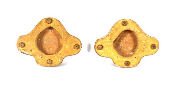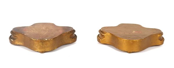 Pair of antique small gilded and carved wooden bases with an arched shape
