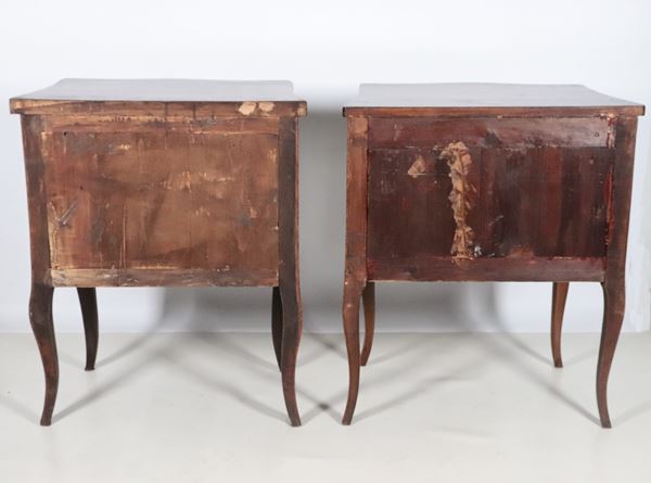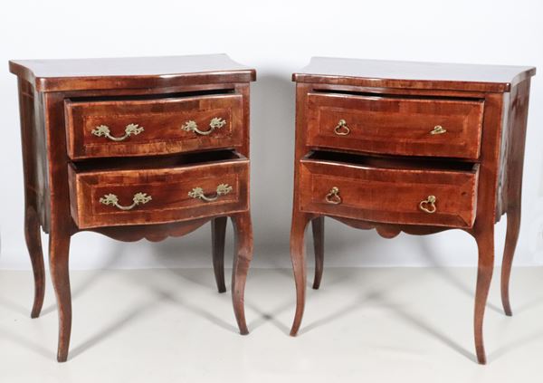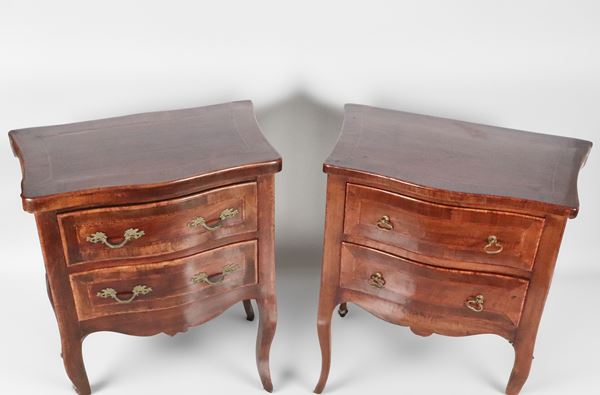 Pair of Louis XVI style bedside tables in walnut, with rosewood inlaid fillets, two drawers and four curved legs each. The bedside tables have [..]