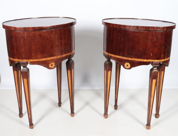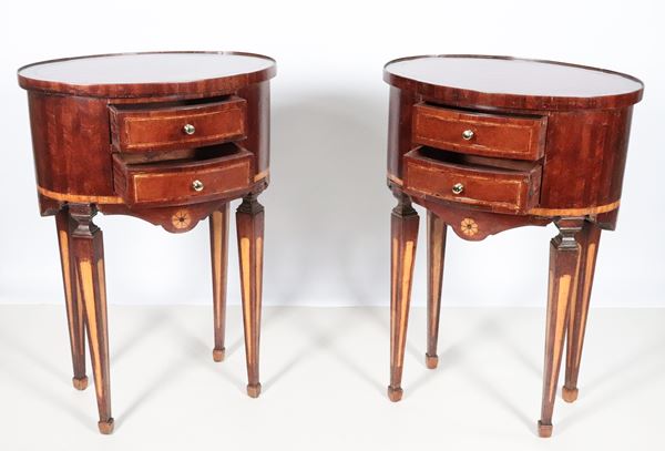 Pair of oval drum-shaped bedside tables in walnut, with boxwood and satin wood inlays, two drawers and four inverted pyramid-shaped legs each [..]