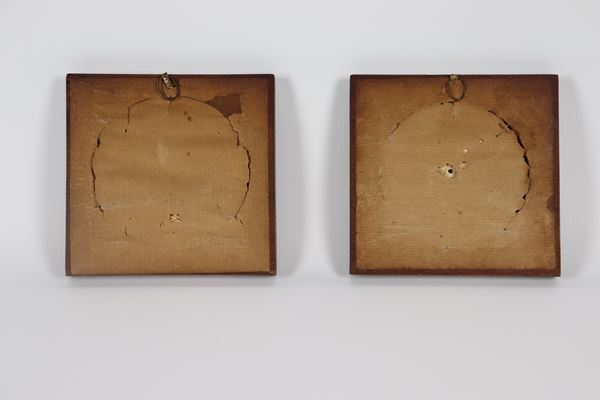Pair of painted round miniatures depicting "Landscapes with ruins and wayfarers", walnut frames