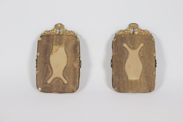 Pair of small antique frames in gilded copper, embossed and chiselled with Louis XVI motifs, inside old photographs