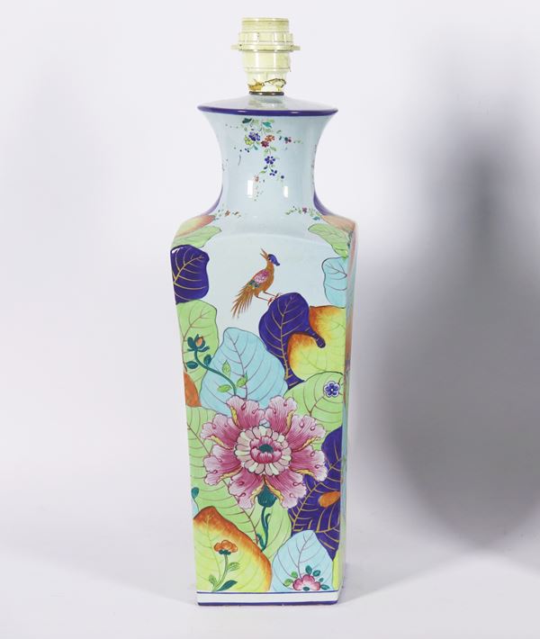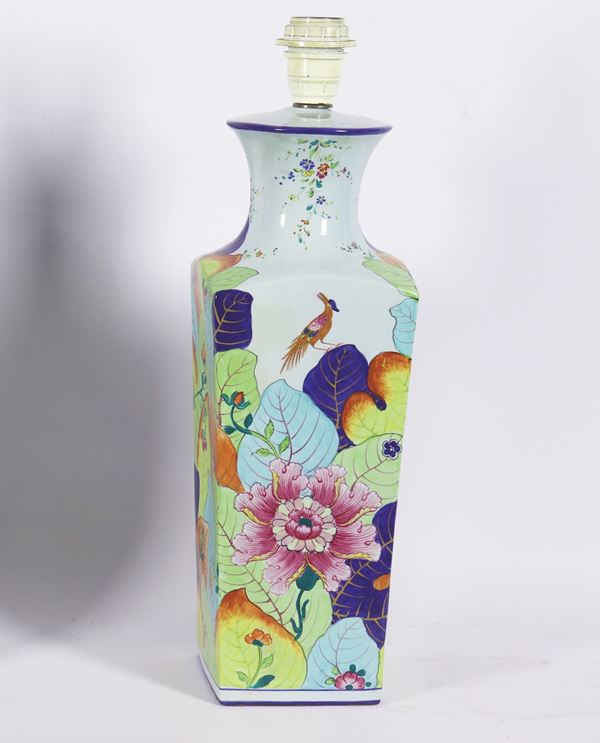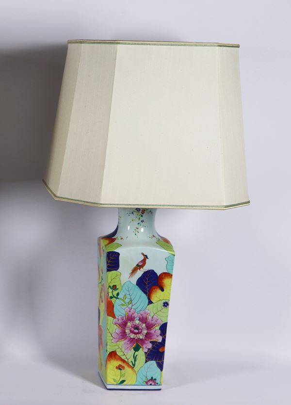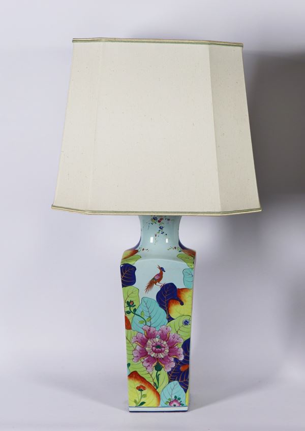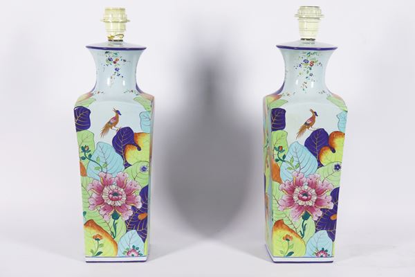 Pair of square-shaped table lamps, in polychrome porcelain with decorations of flowers and exotic birds