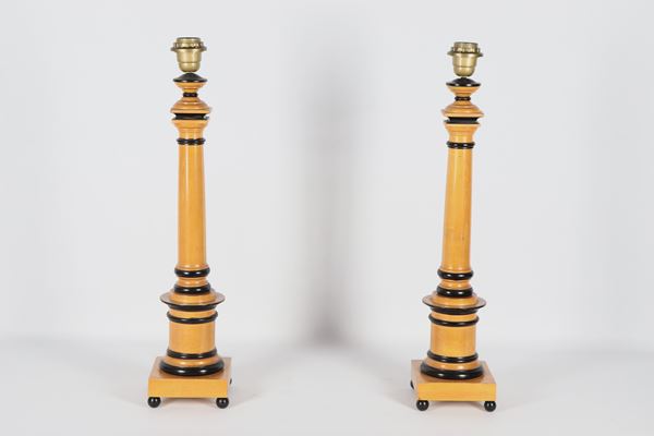 Pair of table lamps in the shape of turned columns in pickled wood with ebonized profiles