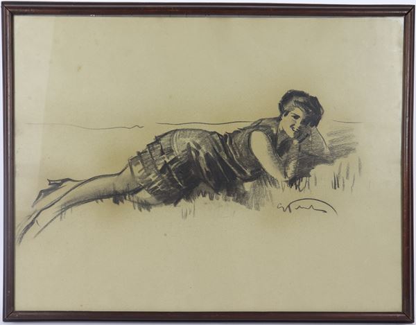 Signed. "Lying girl", charcoal drawing on paper, walnut frame