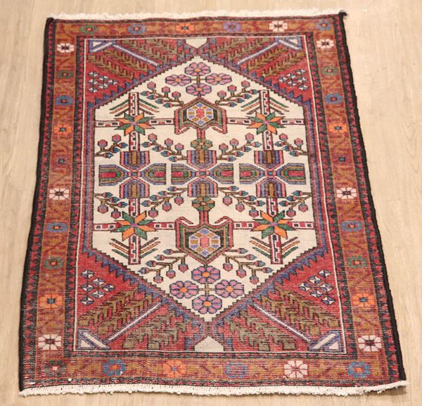 Persian carpet Soumac with geometric and floral designs on white and antique pink background