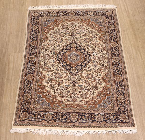 Persian Nain rug, mixed silk, geometric floral design on a brown and brown background and blue border