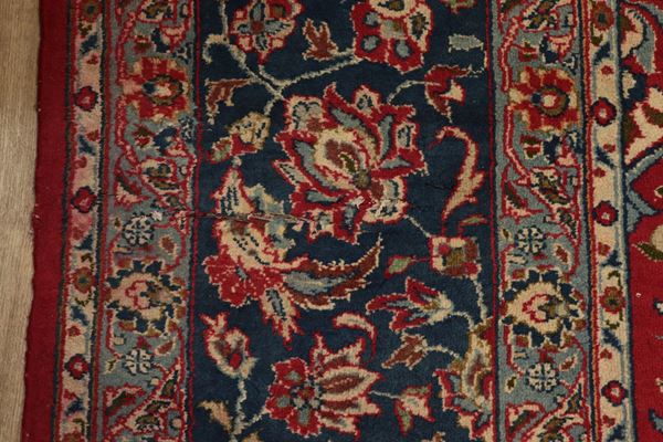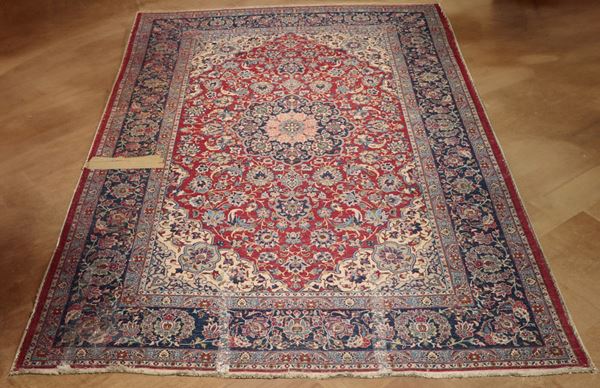 Persian rug Mashad with geometric floral design on red and brown background. The rug has a cut on one of the side edges