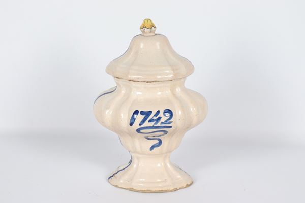Pharmacy jar with lid, in Cerreto Sannita majolica with polychrome decorations with floral motifs