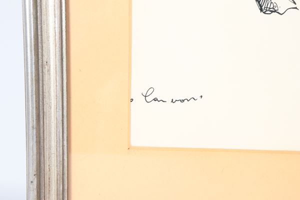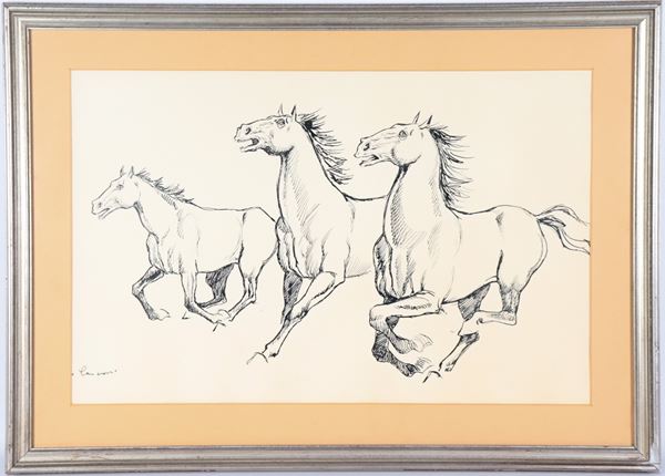 Signed. "Galloping Horses", ink drawing on paper, silvered wooden frame and passepartout