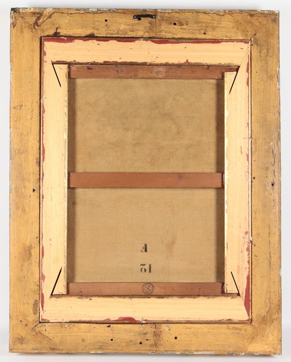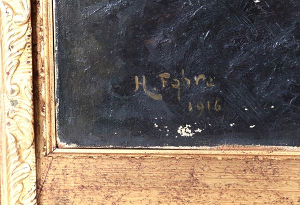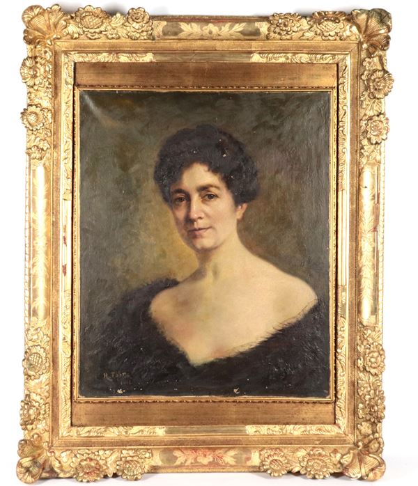 Signed and dated 1916. "Portrait of a woman with a stole", oil painting on canvas in a gilded and carved wooden frame