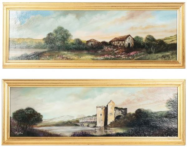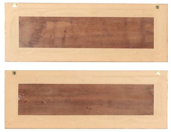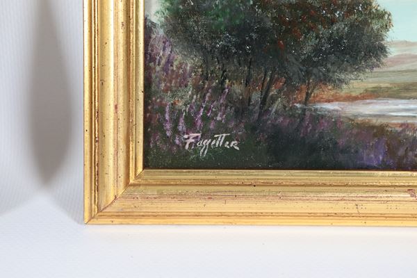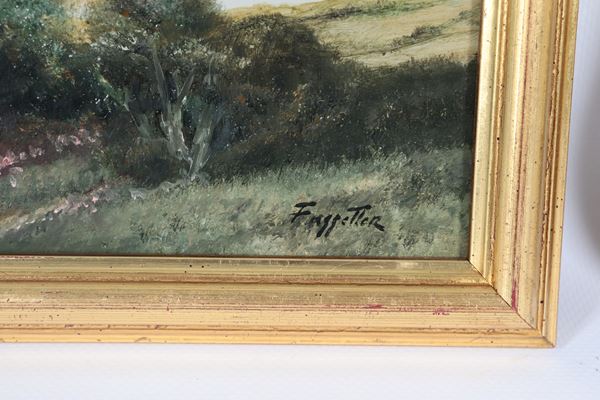 Signed. "Landscapes with watercourses", pair of small oil paintings on panel in gilded wooden frames