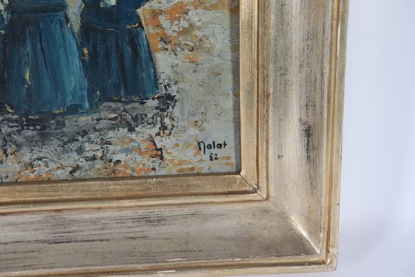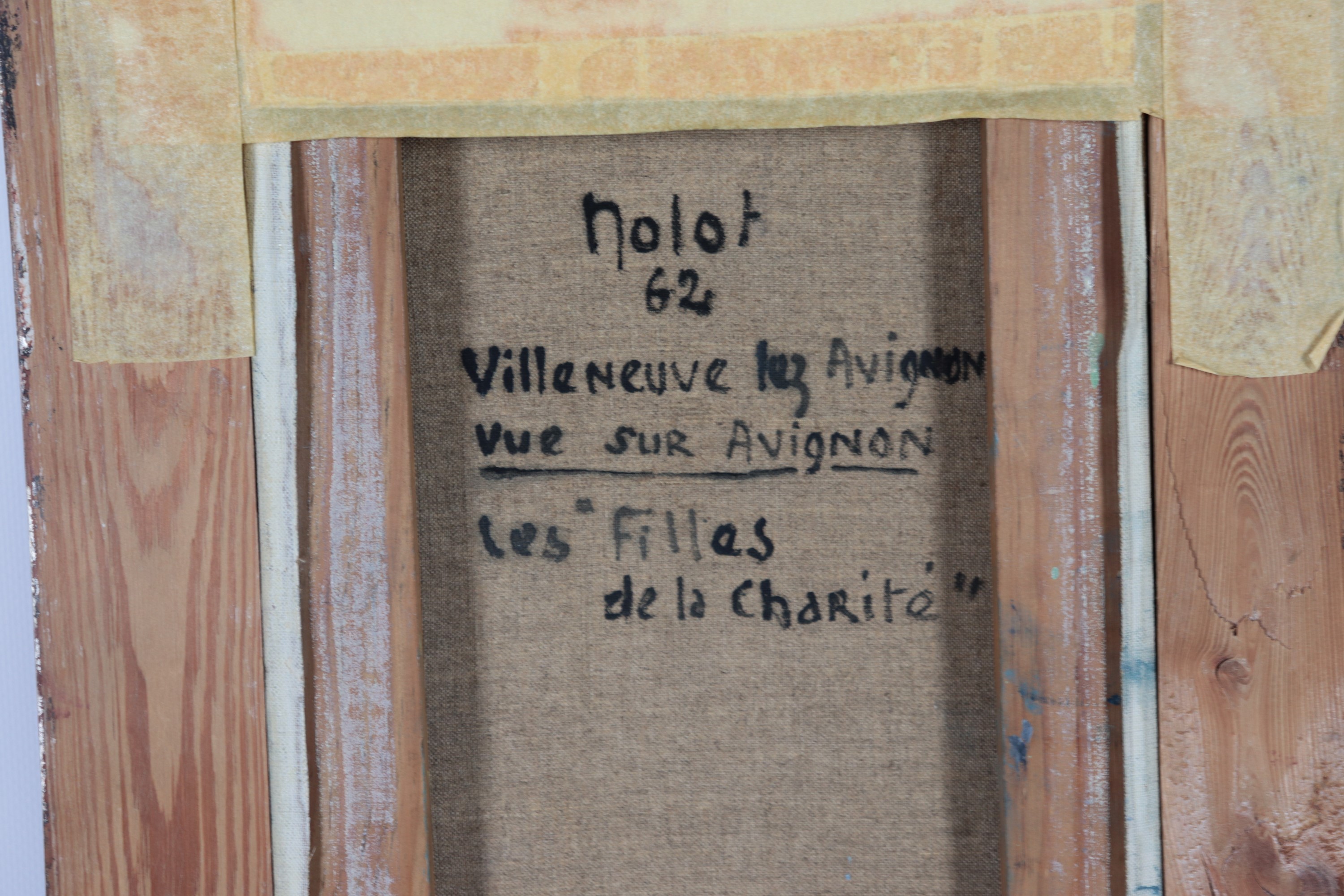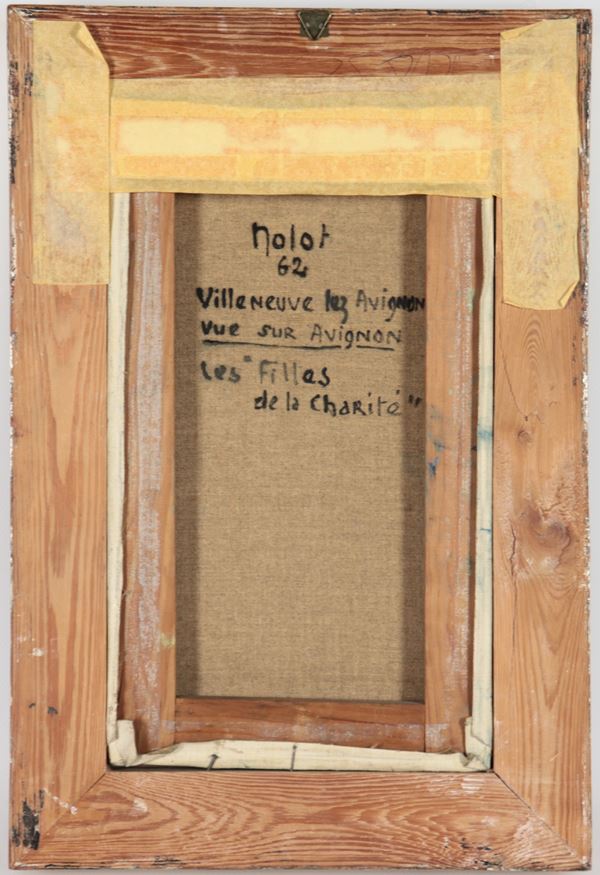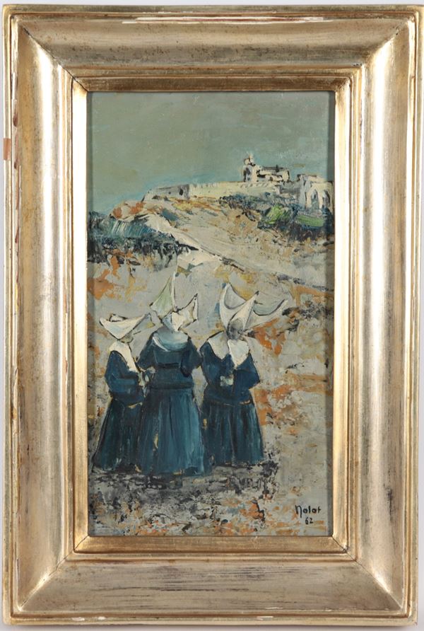 Signed and dated 1962. "View of the Collegiale Notre-Dame de Villeneuve-lès-Avignon with the nuns walking", small oil painting on [..]