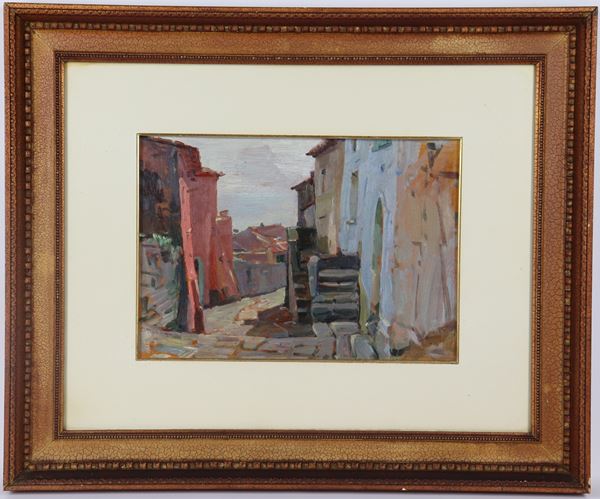 "Glimpse of a village alley", small oil painting, golden frame and passepartout