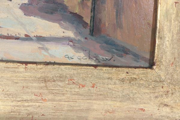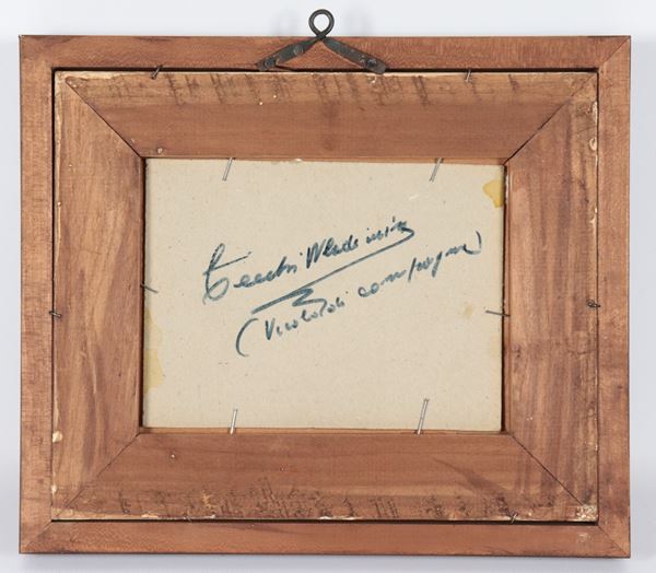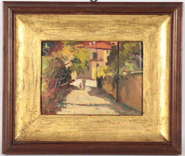 Signed. "Country Lane with Mother and Daughter", small oil painting on cardboard in walnut frame