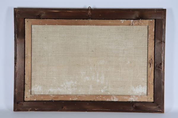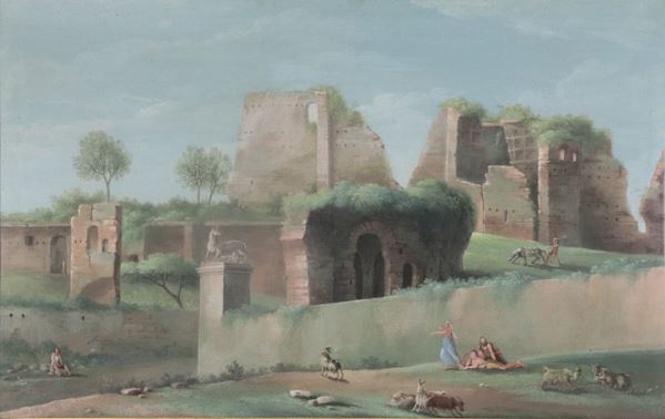 "View of Roman ruins with shepherds and farmers", bright tempera painting on paper applied to canvas in a gilded wooden frame