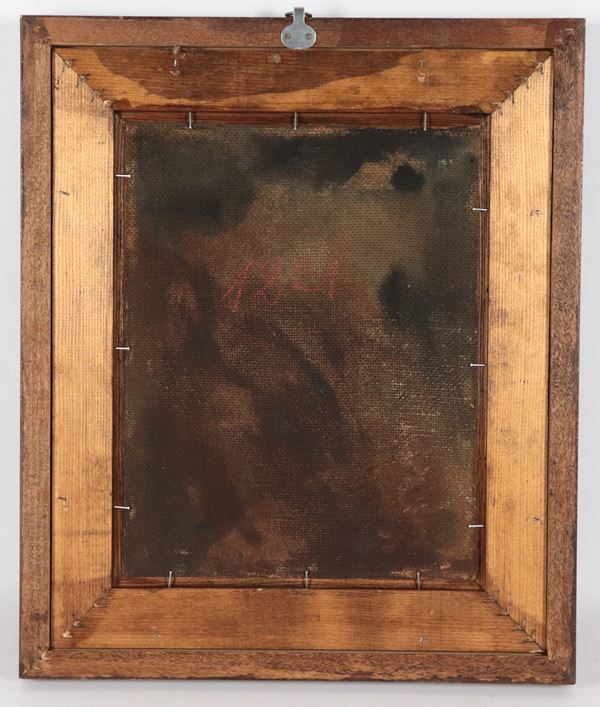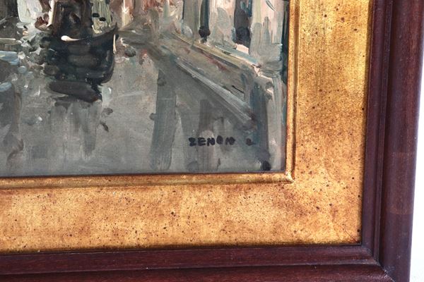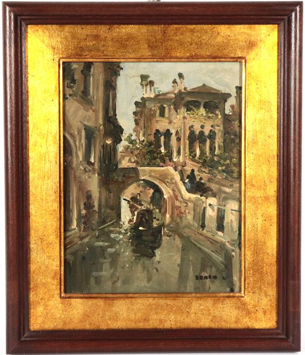 Signed. "Calle a Venezia con gondoliere", small oil painting on canvas in walnut frame and gilded wood passepartout