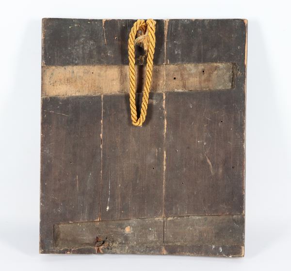 "Mother of God of the Sign", ancient Russian icon painted on wood. Defects with paint loss and two cracks on the wood