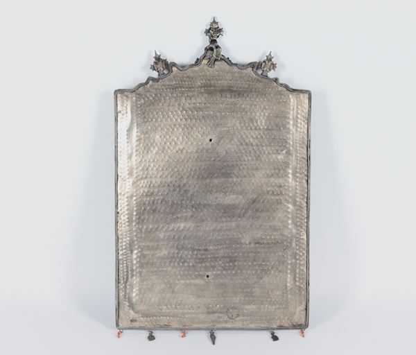 "Mother of God", Russian icon painted on wood in a chiseled and embossed copper frame with applications of semiprecious stones