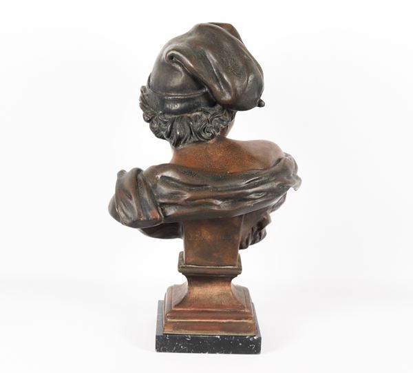 "Smiling urchin", bronze bust supported by a quadrangular marble base. Signed