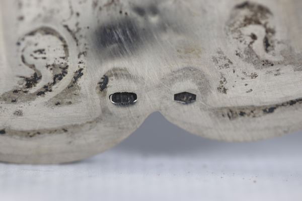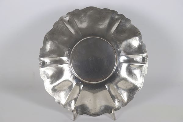 Round silver centerpiece with shaped and embossed edge and green stone applications. Early 20th century manufacture, gr. 565