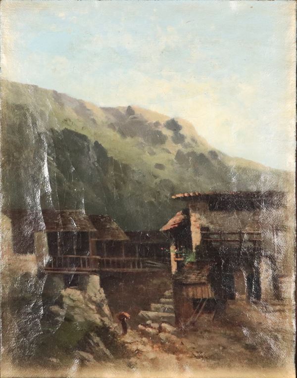 "Alpine landscape with mountain pastures and peasant woman", oil painting on canvas in a gilded and decorated wooden frame