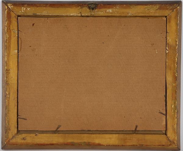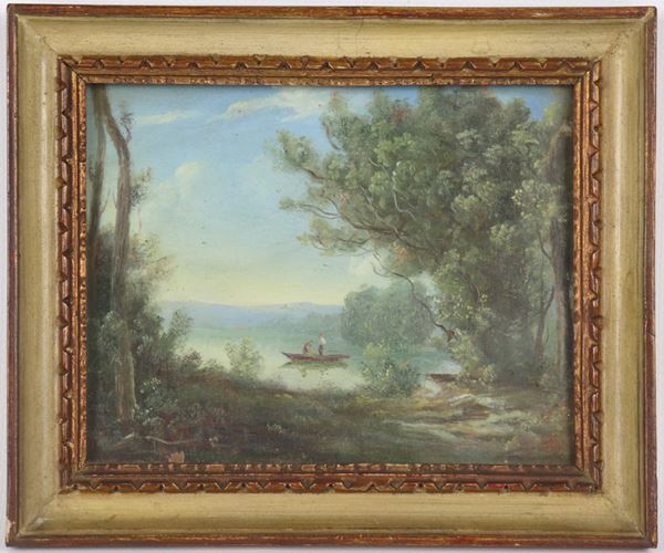 "Landscape with a view of a lake, fishermen and trees", small oil painting on pressed cardboard, gilded and white lacquered frame