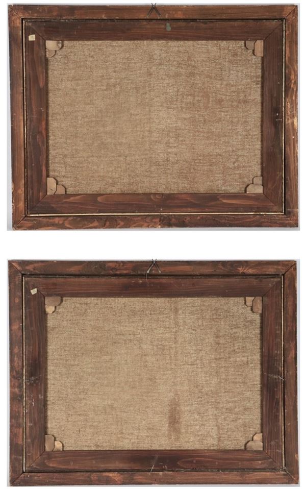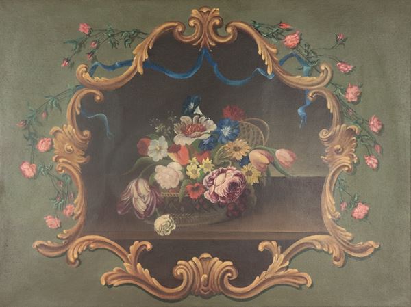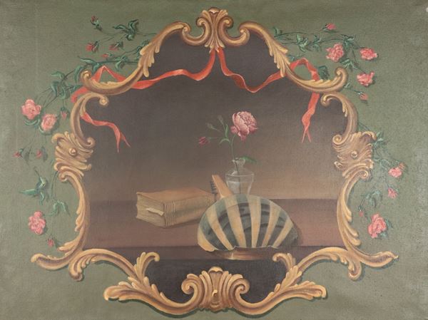 "Still Lifes of Flowers and Book with Musical Instrument", Pair of Oil Paintings on Canvas in Gilded Wooden Frames