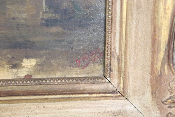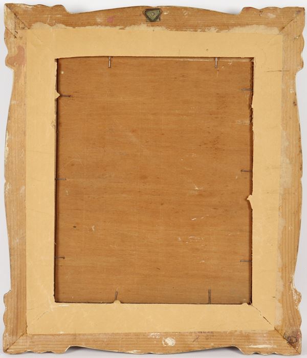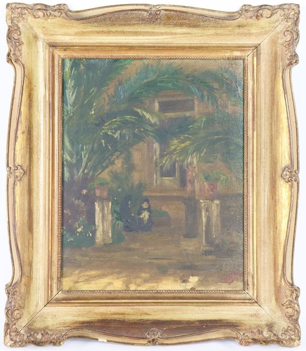 Signed and dated 1933. "Convent Garden with Nuns", small oil painting on plywood, pickled wooden frame