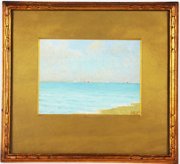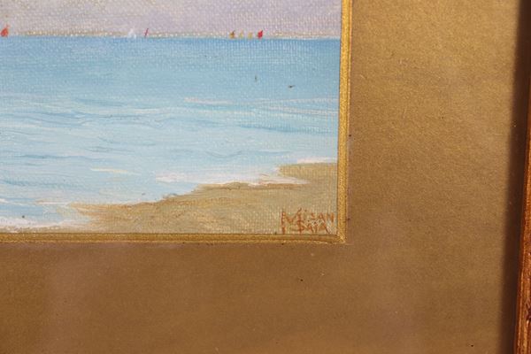 Signed. "Marina with sailing boats", small oil painting on canvas, golden frame and passepartout
