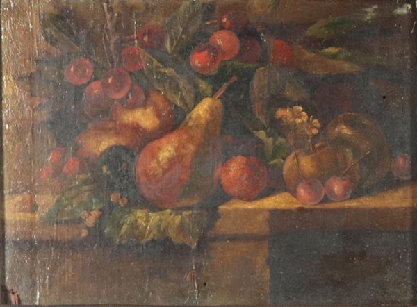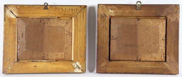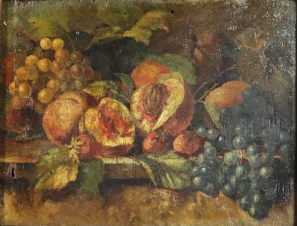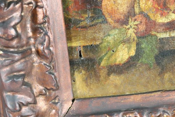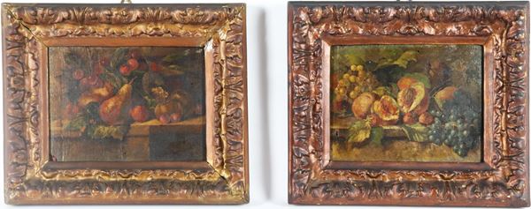 "Still Lifes of Fruit", pair of small oil paintings on wood, gilded and carved wooden frames