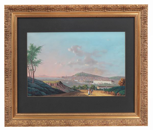 "View of Naples with the Albergo dei Poveri and travelling peasants", ancient Neapolitan gouache painted on paper in a gilded frame [..]