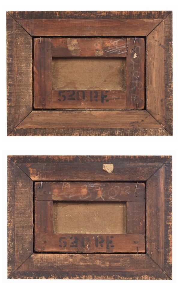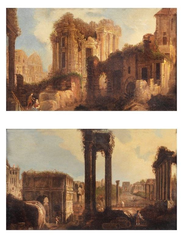 "View of the Roman Forum" and "Fantasy of ruins with commoners", pair of small oil paintings on paper applied to canvas, [..]