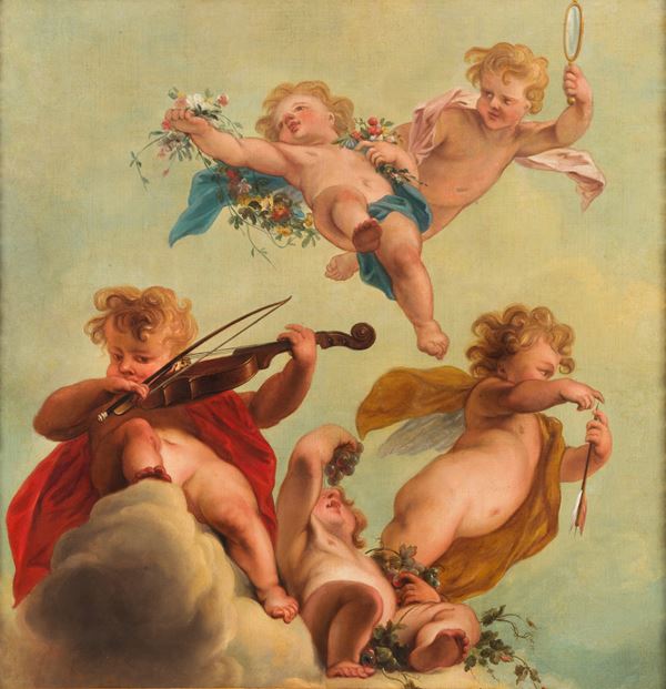"Allegory of Festive Putti", a valuable oil painting on canvas of fine pictorial quality in a gilded and carved wooden frame