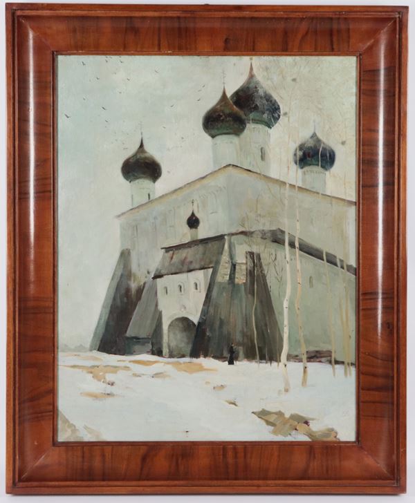 "View of Orthodox Church", bright oil painting on canvas in walnut frame