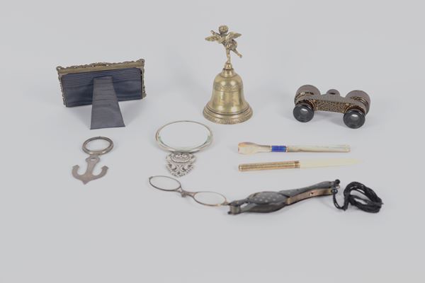 Set of a mouthpiece, a small letter opener, a pair of opera glasses, a small mirror, a magnifying glass, a table bell, a picture frame and removable [..]
