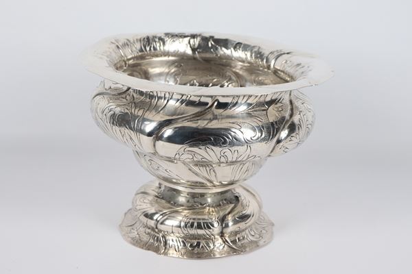 Silver vase, entirely chiseled and embossed with scrolls of flowers and leaves. Old welding under the edge, gr. 600