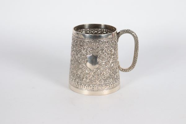 Small oriental silver jug, entirely chiseled and embossed with floral interlacing motifs, 180 gr.