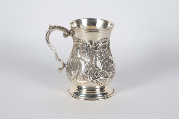 Small silver mug, chiseled and embossed with leaf and flower motifs, curved handle, 390 gr.