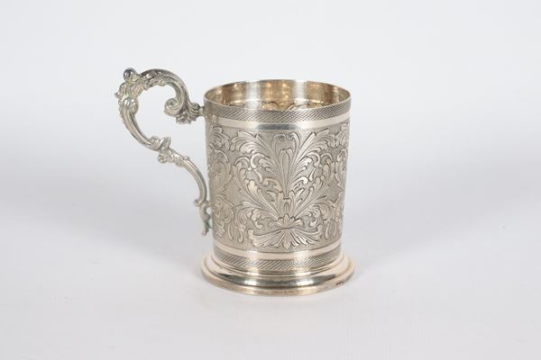 Small silver mug, chiseled and embossed with plant motifs, curved handle, 210 gr.