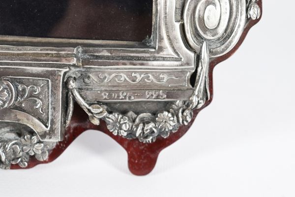 Table frame in silver Title 925, chiselled and embossed with Louis XVI motifs, on the top small sculptures of vestal and putto, wooden suppor [..]