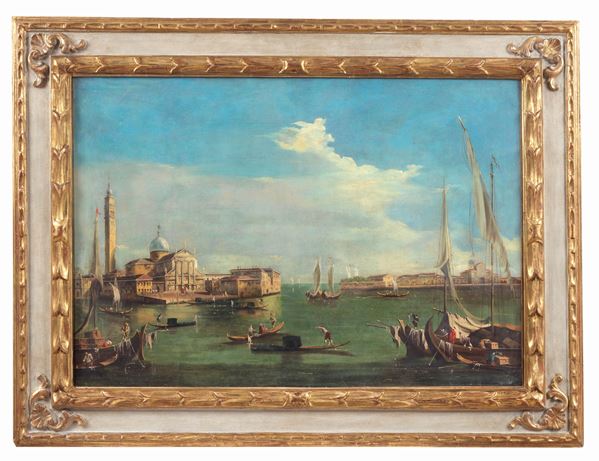 Att.to. "View of Venice with San Giorgio Maggiore", valuable oil painting on canvas in a gilded and white lacquered frame