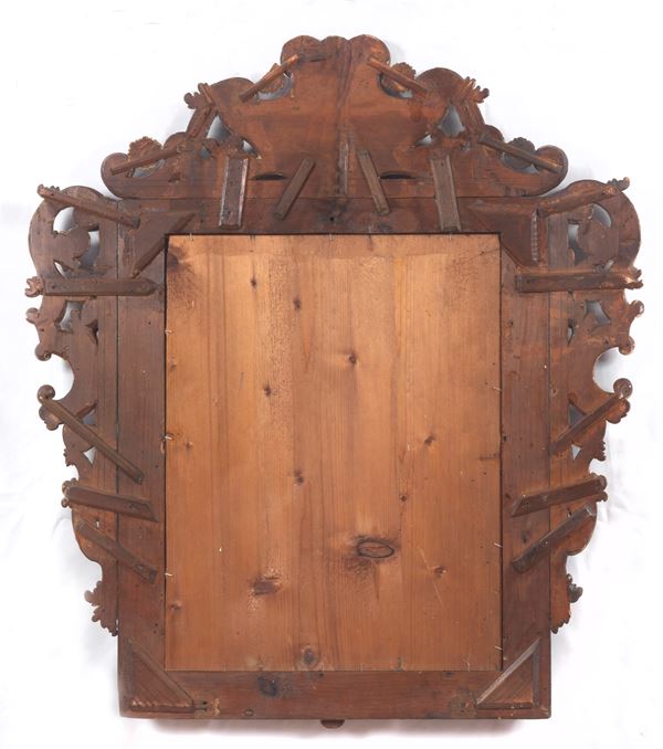 Tuscan mirror in Louis XIV style in lacquered and gilded wood, richly carved with scrolls, acanthus leaves and curls, with an inscription on [..]