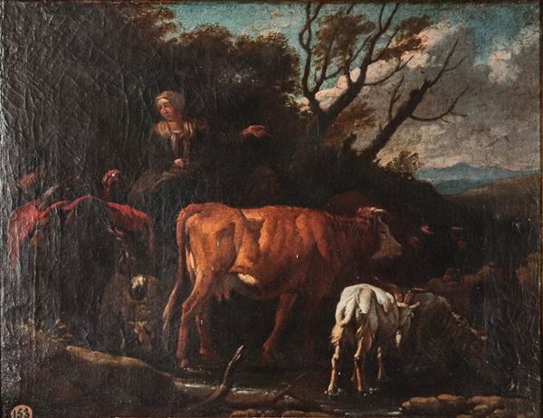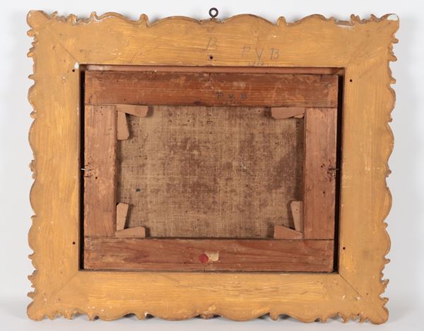 Bottega di. "Landscape with peasant woman, shepherd and herds with goats", small oil painting on canvas. Gilded and richly carved [..]